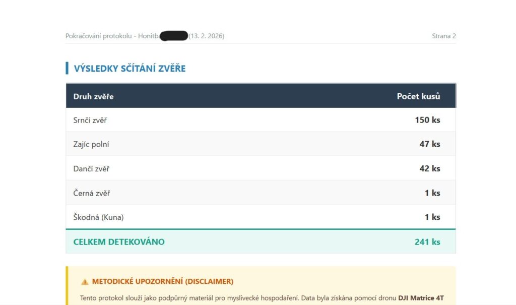• Interaktivní protokol (PDF): Přehledná zpráva s mapou lokalizace a přesnou tabulkou sčítání. V tomto konkrétním případě jsme detekovali celkem 241 kusů zvěře, z čehož největší zastoupení mělo srnčí (150 ks), následované zajícem (47 ks) a daňčí zvěří (42 ks).